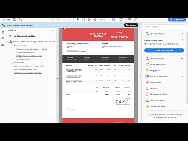 Elektronikus számlák ellenőrzése Acrobat Reader PDF olvasóban.
